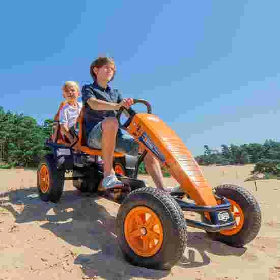 The 5-spoke rims and large tyres look great and ensure the go-kart is fun to drive: the tyres absorb any unevenness on the surface beneath. The ball-bearing-mounted wheels run smoothly – ideal for effortless driving. The go-kart has a swing axle so that the four wheels will always stay on the ground, even when driving over bumps. The recirculating-ball steering guarantees excellent manoeuvrability.