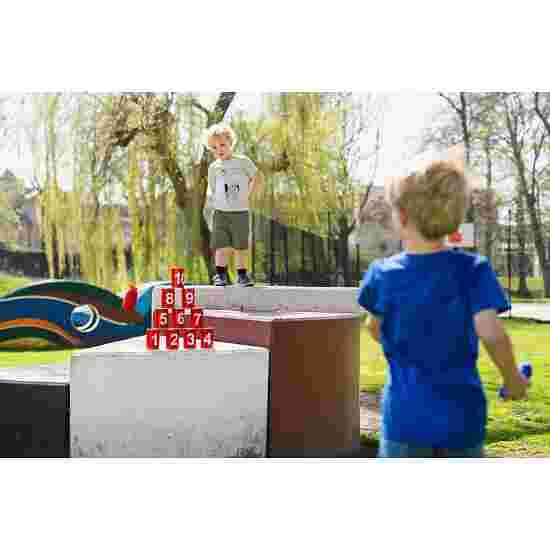 The throwing game consists of ten red, numbered cans and three colourful throwing bags. With this game children can practise their aim and knock down the cans with small bags. Simply stack the metal cans and the game can begin. Whether arranged as a pyramid or set up in a row, the possibilities are endless. Alone or in a team – who can knock down all the cans with the bag?