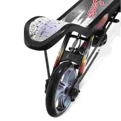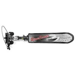 This unusual scooter is a real head turner! The patented original is the popular trend from Canada and the USA. It is powered by placing one foot at the front and the other foot at the back of the scooter’s angled foot board, and rocking back and forth on it. It is driven forward by a chain which powers a flywheel with every rocking movement. This allows the trendy scooter to reach reasonable speeds with ease – and makes it great fun at the same time. The effective rear-wheel brake on the handlebar brings the Space Scooter to a stop in a safe and controlled manner. A built-in air pressure shock absorber on the rear wheel, large PU wheels and the handlebar with soft grips all provide comfort, even when riding on bumpy surfaces. Should you wish to stop rocking, the Space Scooter can be transformed into a normal scooter in no time.