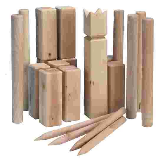 The Summerplay “Kubb” throwing game is great fun for 2–12 people. The set consists of 11 pawns (1 king and 10 “servants”), 6 throwing blocks, 4 marking sticks to set out the playing field and a bag for easy transportation. The pawns, throwing blocks and marking sticks are made of birch wood. The aim of the game is to be the first to knock over the opponent’s “servants” on the battlefield and then knock over the king.